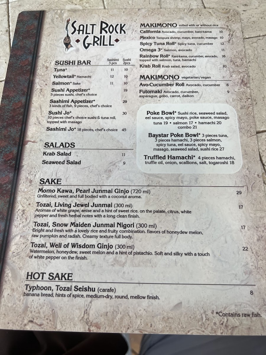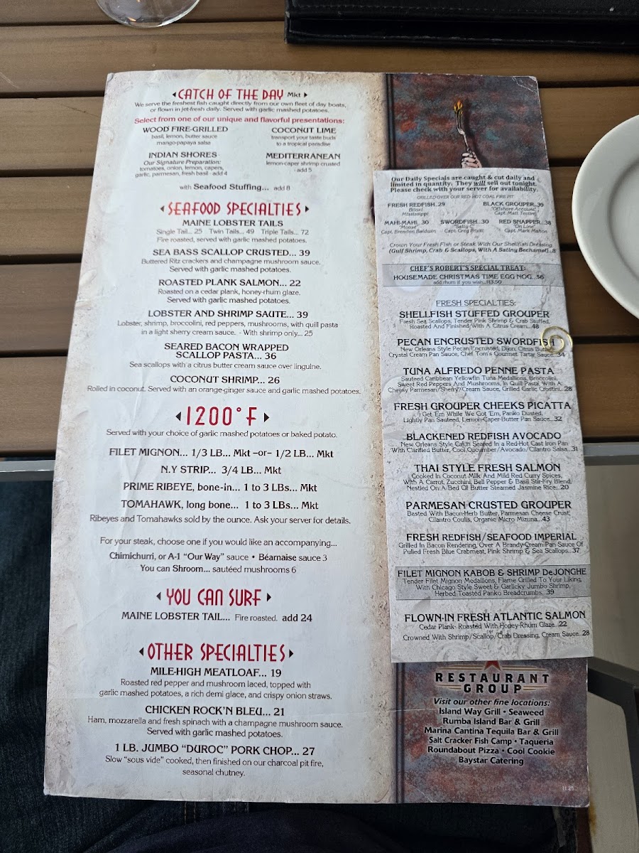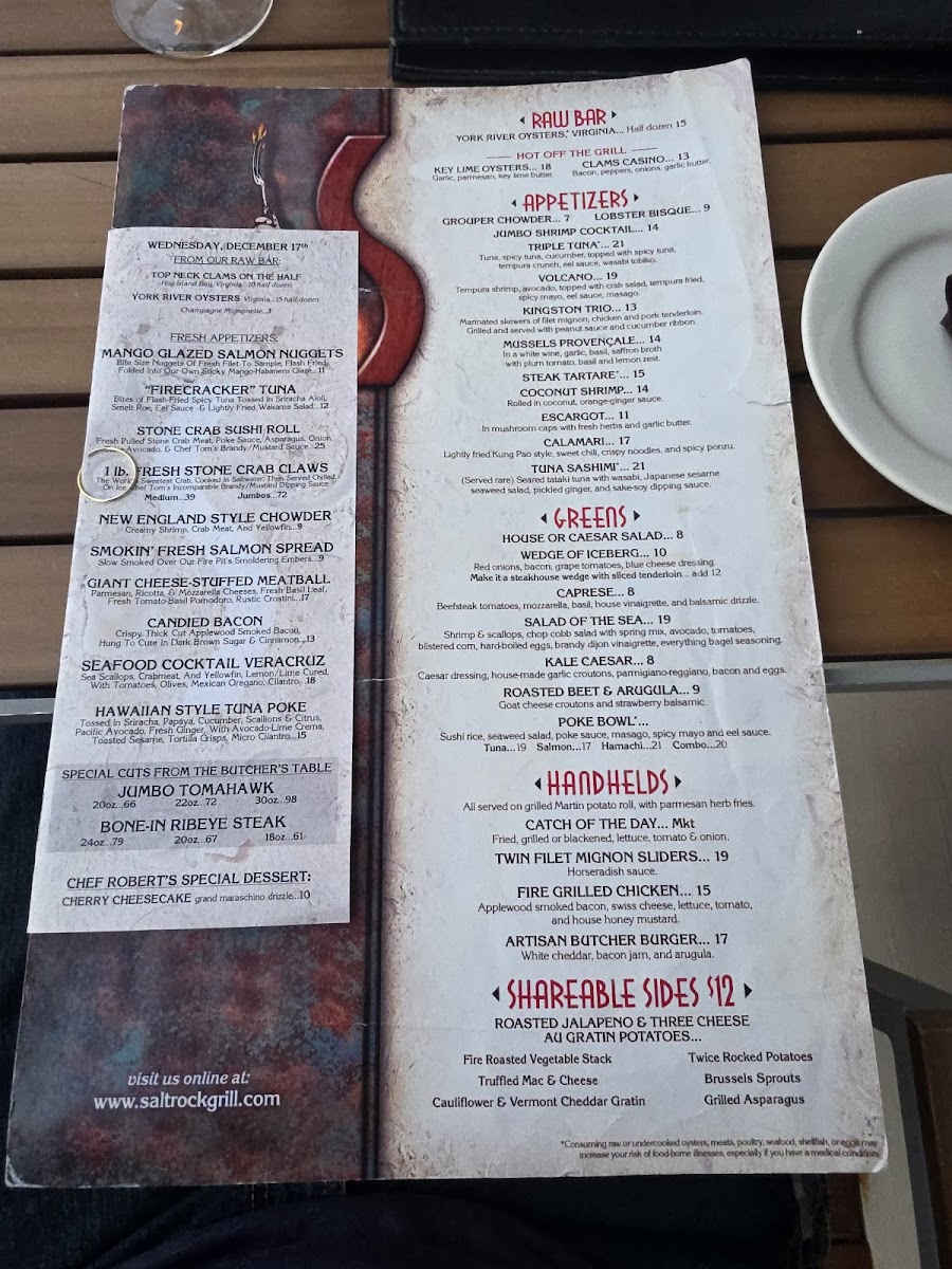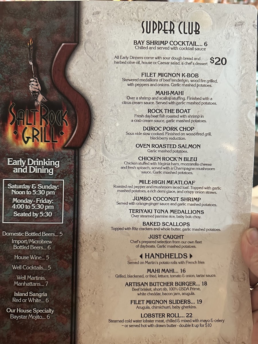 The menu at Salt Rock Grill offers a diverse selection of seafood, steaks, and bar favorites, carefully organized into several main categories to cater to a variety of dining preferences. Guests can begin with appetizers such as Grouper Chowder, Lobster Bisque, Jumbo Shrimp Cocktail, and marinated skewers combining filet mignon, chicken, and pork tenderloin. These starters set the stage for a meal focused on fresh and flavorful ingredients.