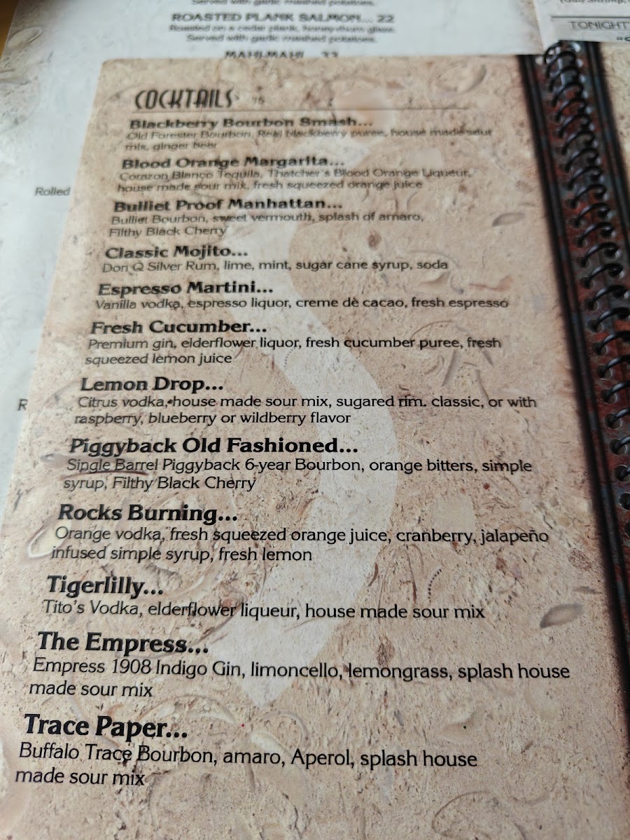 Desserts complete the menu offering traditional favorites such as Key Lime Pie, Hot Apple Crisp Pie, and Banana Bread Pudding. The bar provides a selection of cocktails and non-alcoholic drinks that accompany the food menu throughout the dining experience.